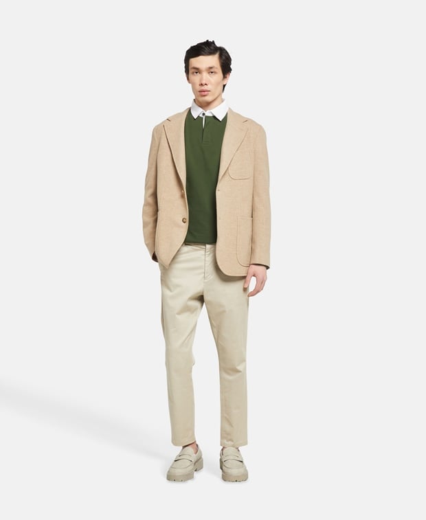 - Kragen: Polokragen mit kurzer Knopfleiste