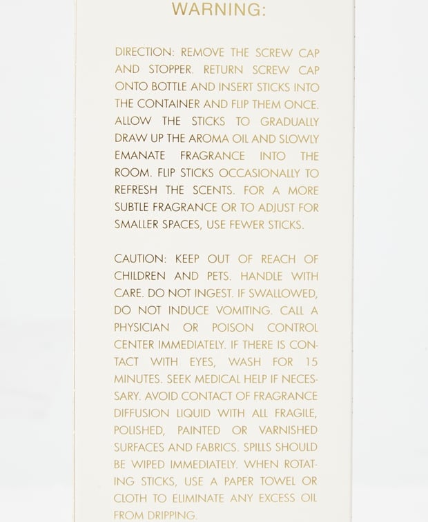 - Achtung, Gefahrenhinweise! Enthält: WARNING: •DIRECTION: REMOVE THE SCREW CAP AND STOPPER. RETURN SCREW CAP ONTO BOTTLE AND INSERT STICKS INTO THE CONTAINER AND FLIP THEM ONCE. ALLOW THE STICKS TO GRADUALLY DRAW UP THE AROMA OIL AND SLOWLY EMANATE FRAGRANCE INTO ROOM. FLIP STICKS OCCASIONALLY TO REFRESH THE SCENTS. FOR A MORE SUBTLE FRAGRANCE OR TO ADJUST FOR SMALLER SPACES, USE FEWER STICKS. THE •CAUTION: KEEP OUT OF REACH OF CHILDREN AND PETS. HANDLE WITH CARE. DO NOT INGEST. IF SWALLOWED, DO NOT INDUCE VOMITING. CALL A PHYSICIAN OR POISON CONTROL CENTER IMMEDIATELY. IF THERE IS CON TACT WITH EYES, WASH FOR 15 MINUTES. SEEK MEDICAL HELP IF NECES SARY. AVOID CONTACT OF FRAGRANCE DIFFUSION LIQUID WITH ALL FRAGILE POLISHED, PAINTED OR VARNISHED SURFACES AND FABRICS. SPILLS SHOULD BE WIPED IMMEDIATELY, WHEN ROTAT- ING STICKS, USE A PAPER TOWEL OR CLOTH TO ELIMINATE ANY EXCESS OIL FROM DRIPPING. •Harmful to aquatic organisms, with long-term effects. Keep out of reach of children Read all instructions carefully and follow them. Contents/age should not be disposed of with household waste and should be disposed of in accordance with regional/national disposal regulations. •Contains COUMARIN. can cause allergic reactions.