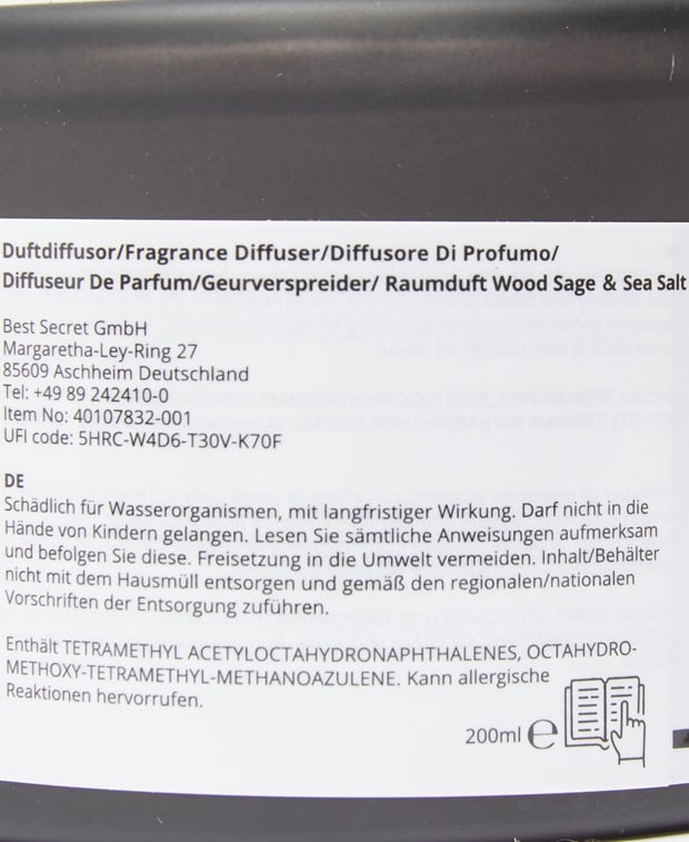 - Achtung, Gefahrenhinweise! Enthält: •Harmful to aquatic organisms with long lasting effects. Keep out of reach of children. Read all instructions carefully and follow them. Avoid release into the environment. Do not dispose of contents/container with household waste and in accordance with regional/national regulations Dispose of according to regulations. •Contains TETRAMETHYL ACETYLOCTAHYDRONAPHTHALENES, OCTAHYDRO-METHOXY-TETRAMETHYL-METHANOAZULENE. May be allergic cause reactions.